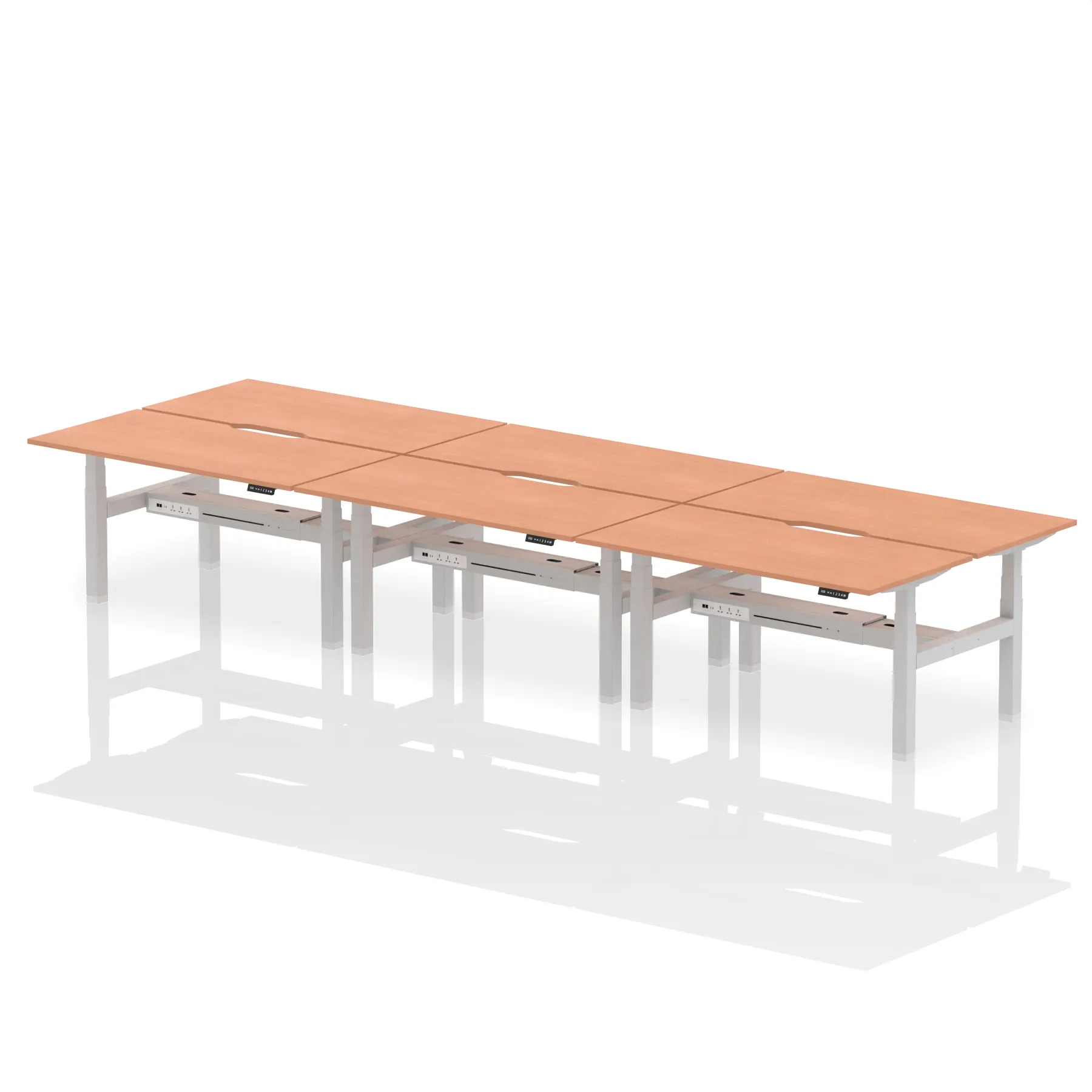 Elevate your team’s workspace with the Air Back-to-Back Height Adjustable Desk for six. This workstation features stylish scalloped edging and is equipped with two Ethernet ports, a USB port, a USB-C port, and three UK plugs per desk, ensuring optimal connectivity. The adjustable height promotes ergonomic working positions. Designed for collaboration and efficiency, it’s the perfect blend of aesthetics and functionality for the modern office.