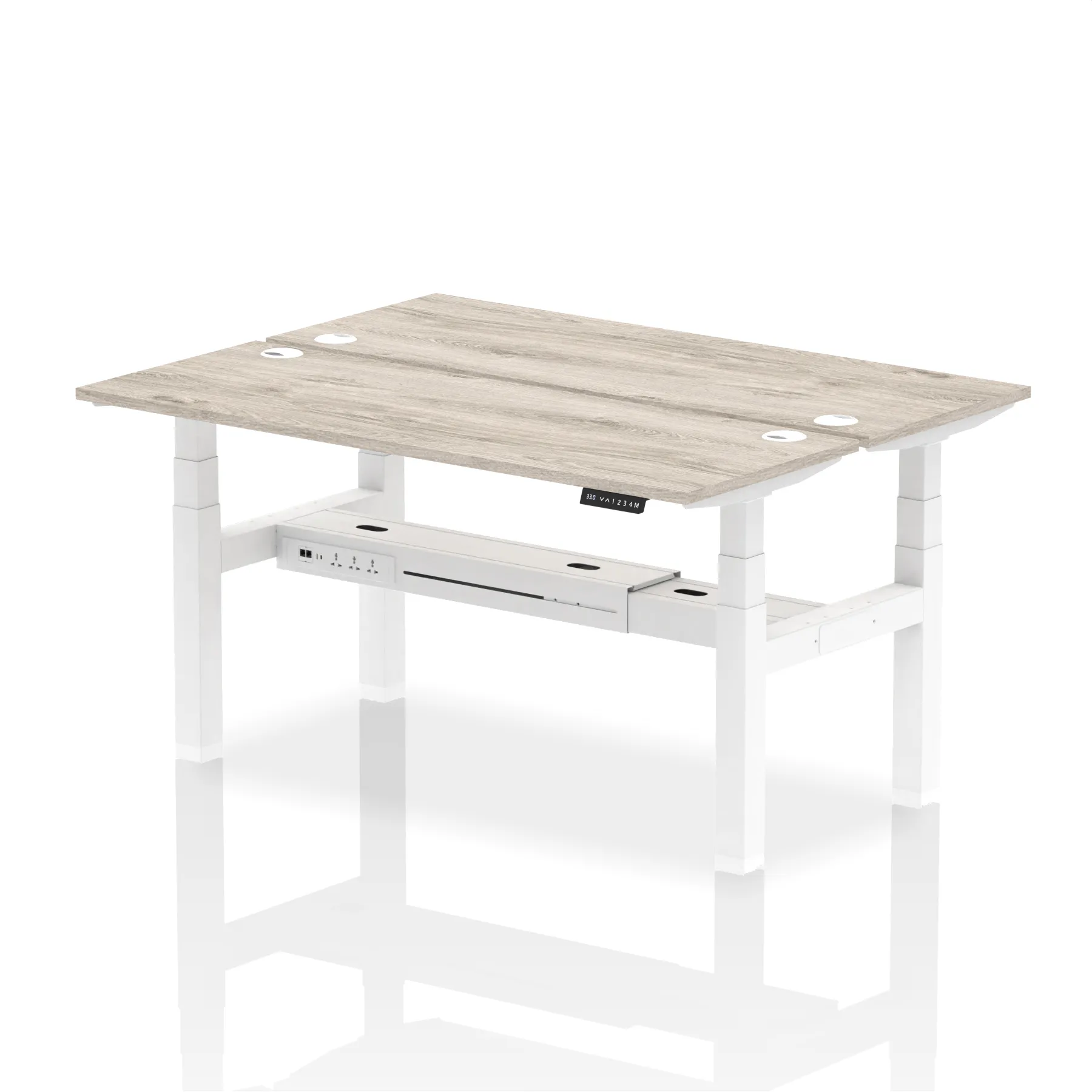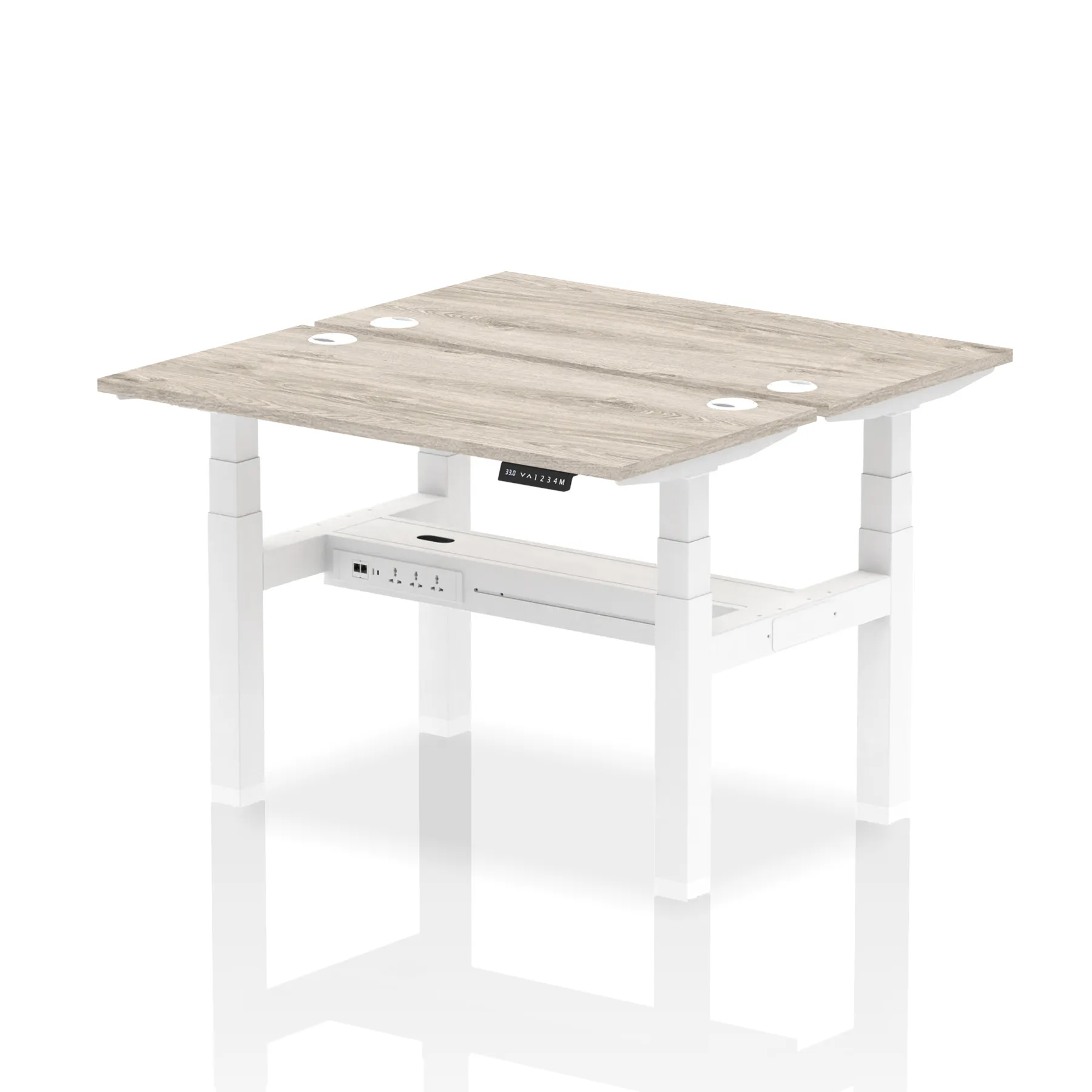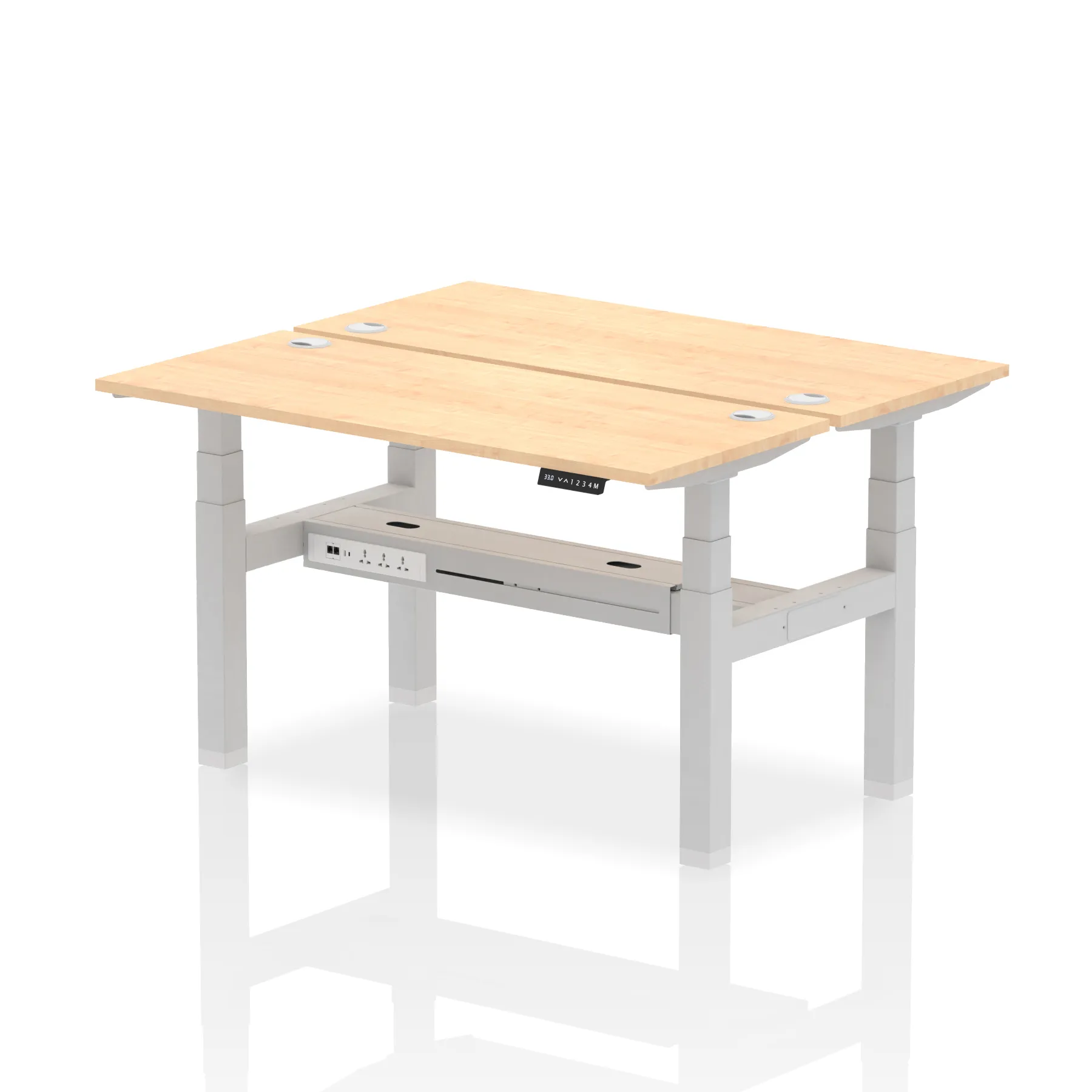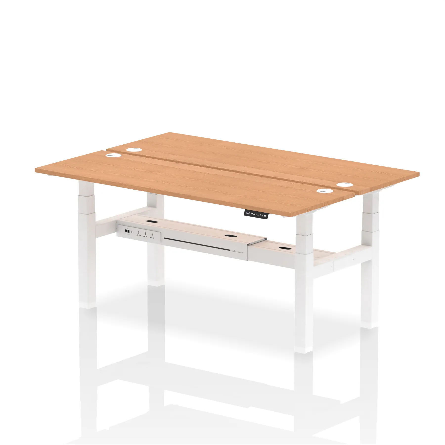 Introducing the Air Back-to-Back Slimline Height Adjustable Desk, a sleek solution for two. Each desk features dual Ethernet ports, a USB port, a USB-C port, and three UK plugs, ensuring comprehensive connectivity. The design includes cable ports for a neat workspace. Its height-adjustable feature caters to ergonomic comfort. Ideal for teams seeking a streamlined and flexible working environment, this workstation redefines collaborative efficiency.