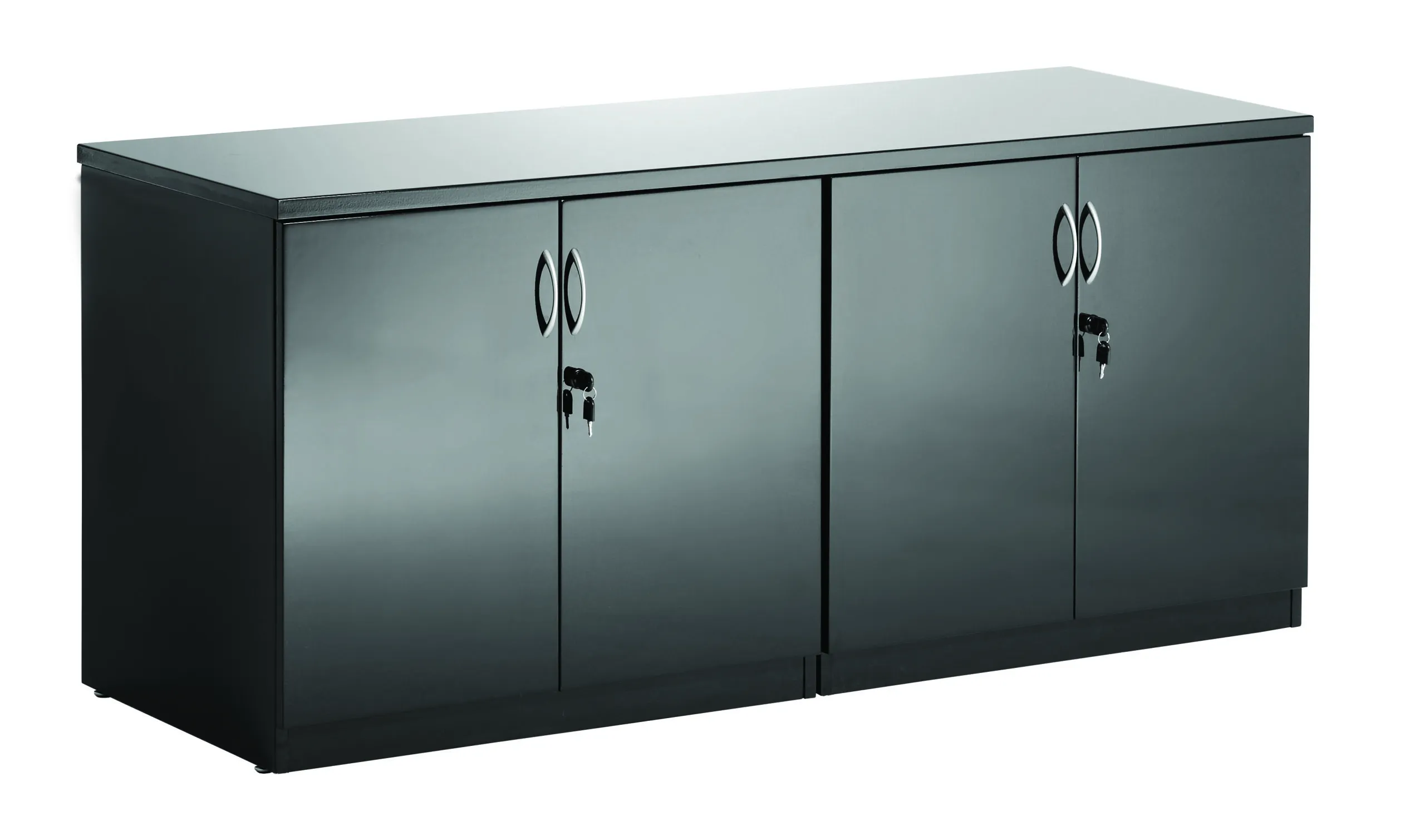 Elegant high gloss polished units | Silver handles | Chrome legs | Protective edging | High sheen black finish | Lockable