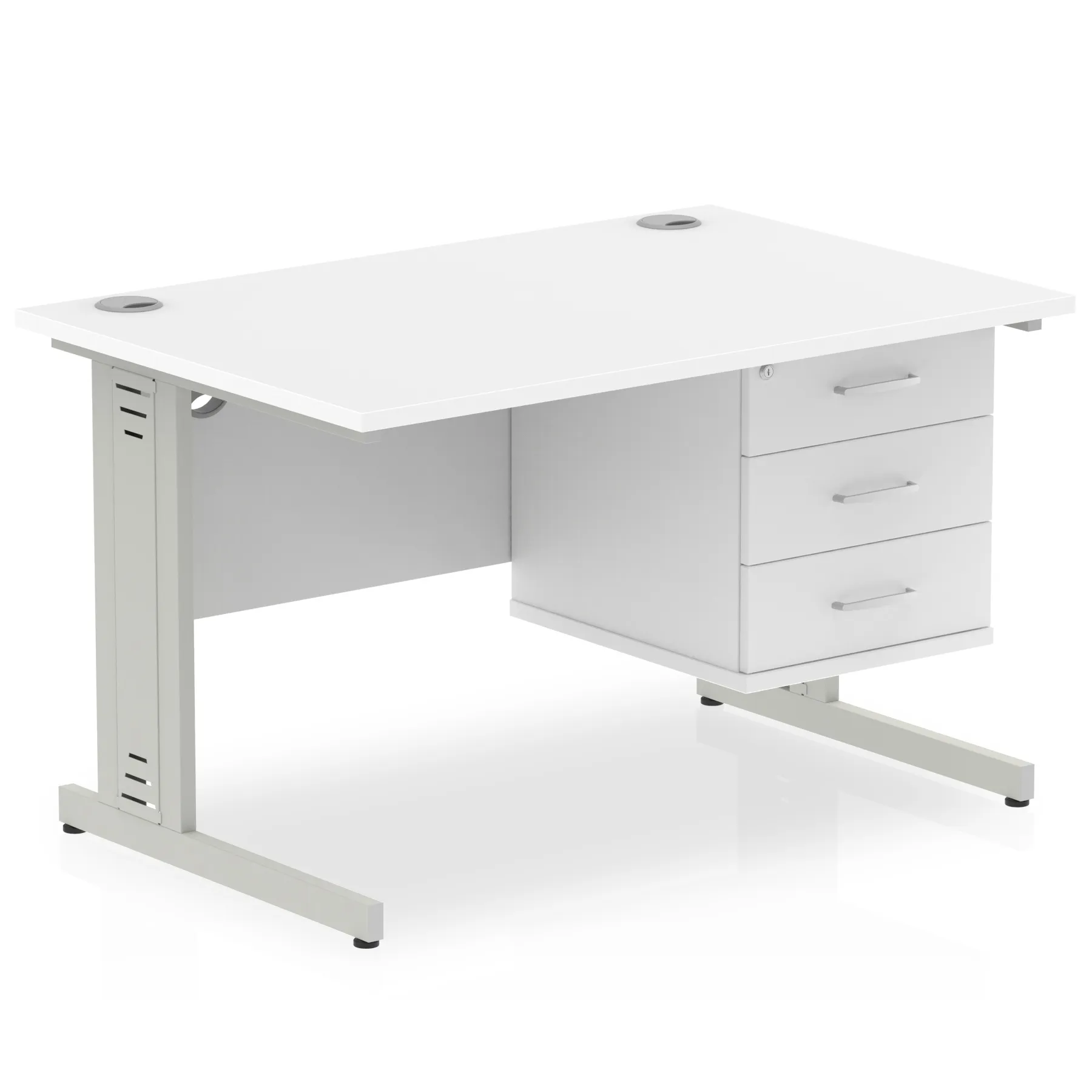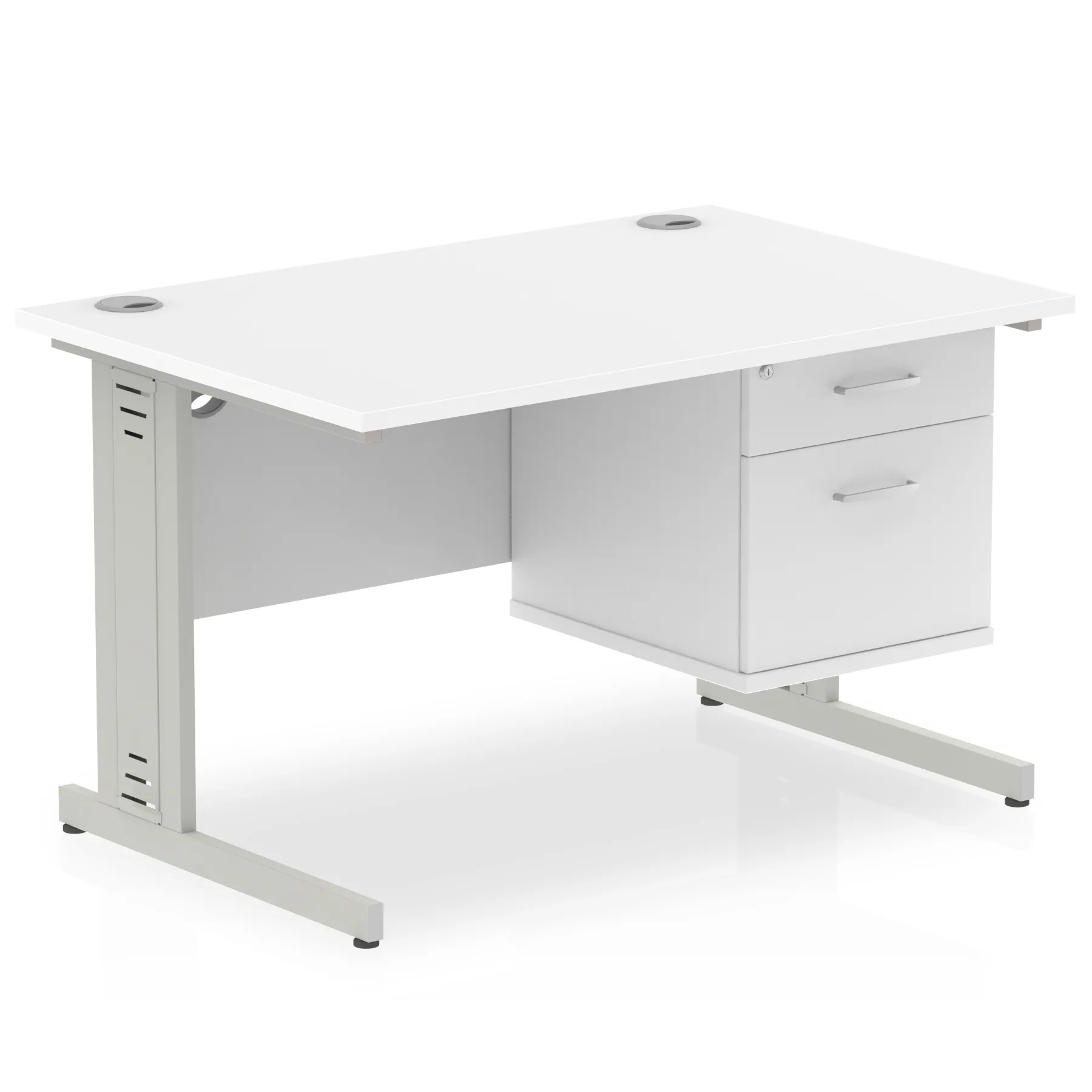 • Impulse contract 1200 wide desk • 25mm tops • Wire management panel • Heat resistant beech melamine finish • 18mm modesty panel • 2mm protective abs edging • Silver coated double strut legs • 2 cable ports • Height adjustable feet • Steel to steel fixings • 2 modesty panel slots • Deep set modesty panel (5”) allows for compatibility of most screen clamp fittings • Fixed pedestal