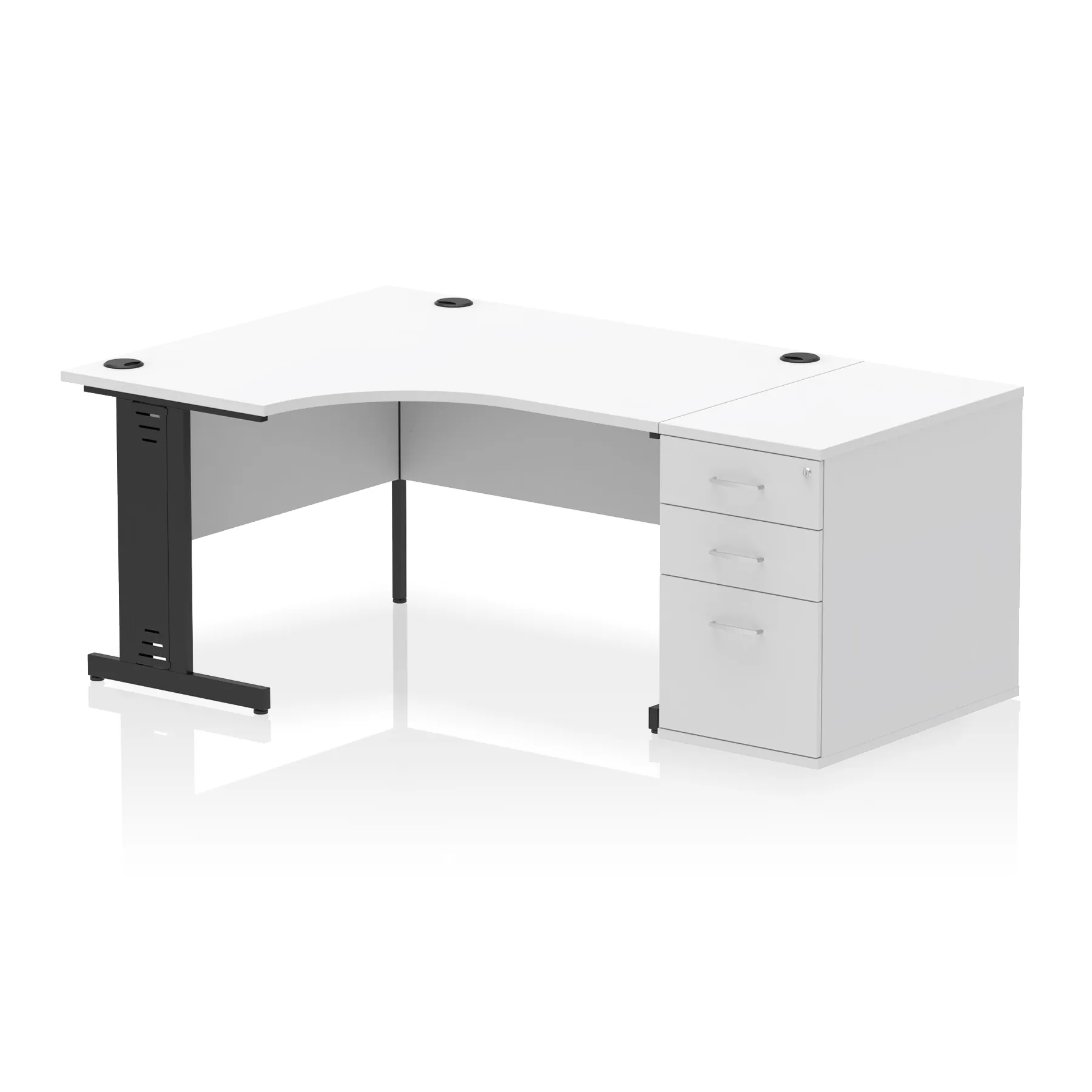 • Impulse contract workstation • 25mm tops • Desk and pedestal combined • Heat resistant melamine finish • 18mm modesty panel • 2mm protective abs edging • Double strut legs • Multiple cable ports • Height adjustable feet • Steel to steel fixings • Modesty panel slots wire slots • Deep set modesty panel (5″) allows for compatibility of most screen clamp fittings