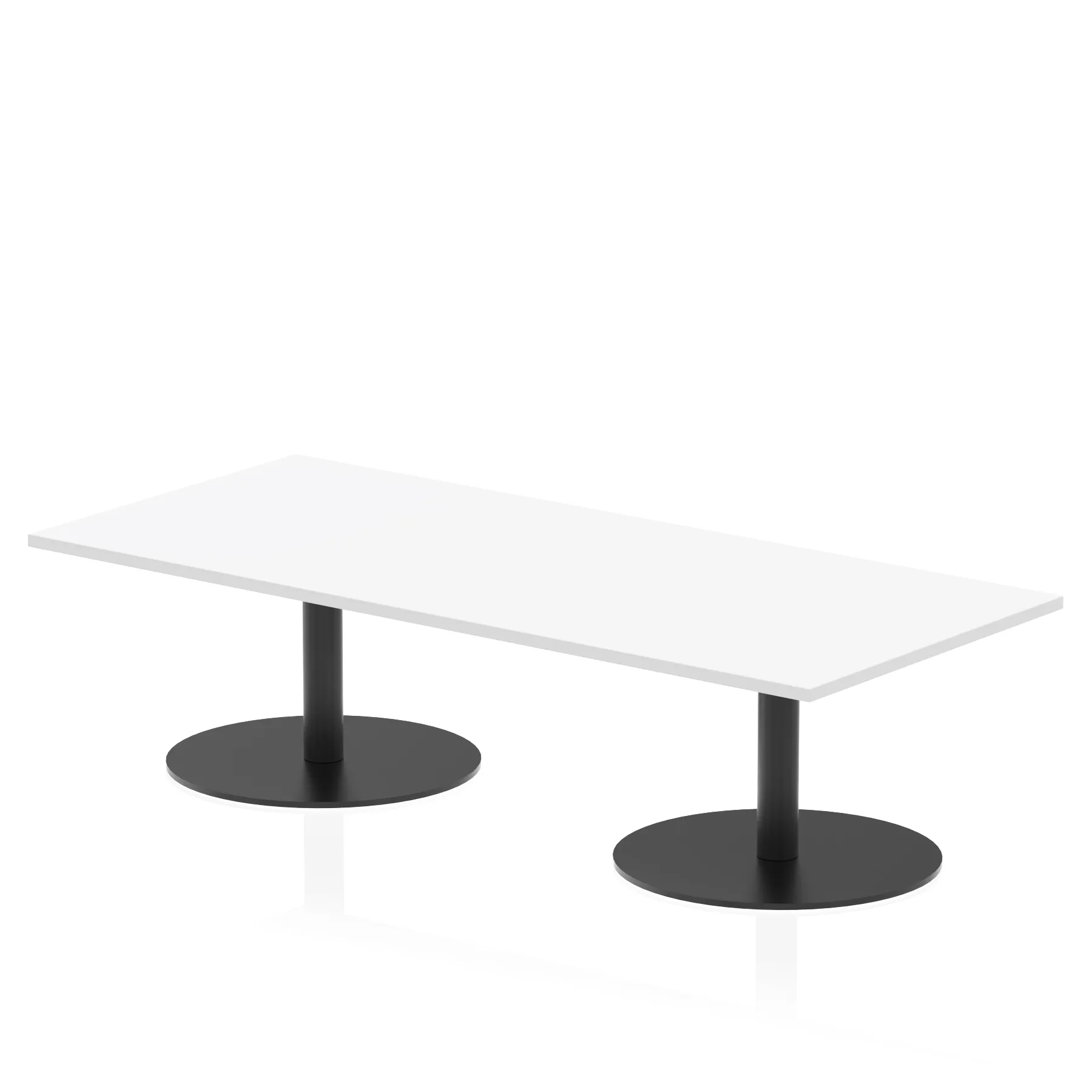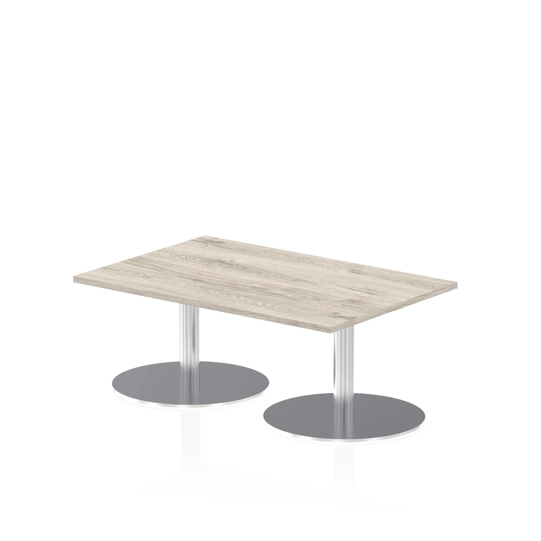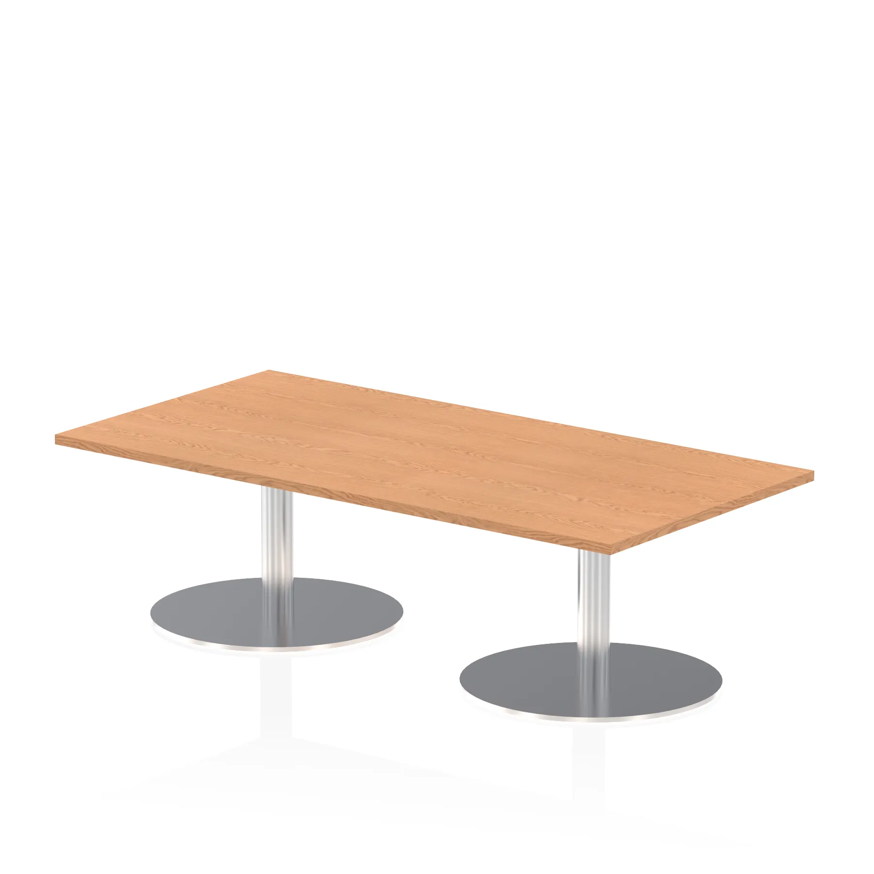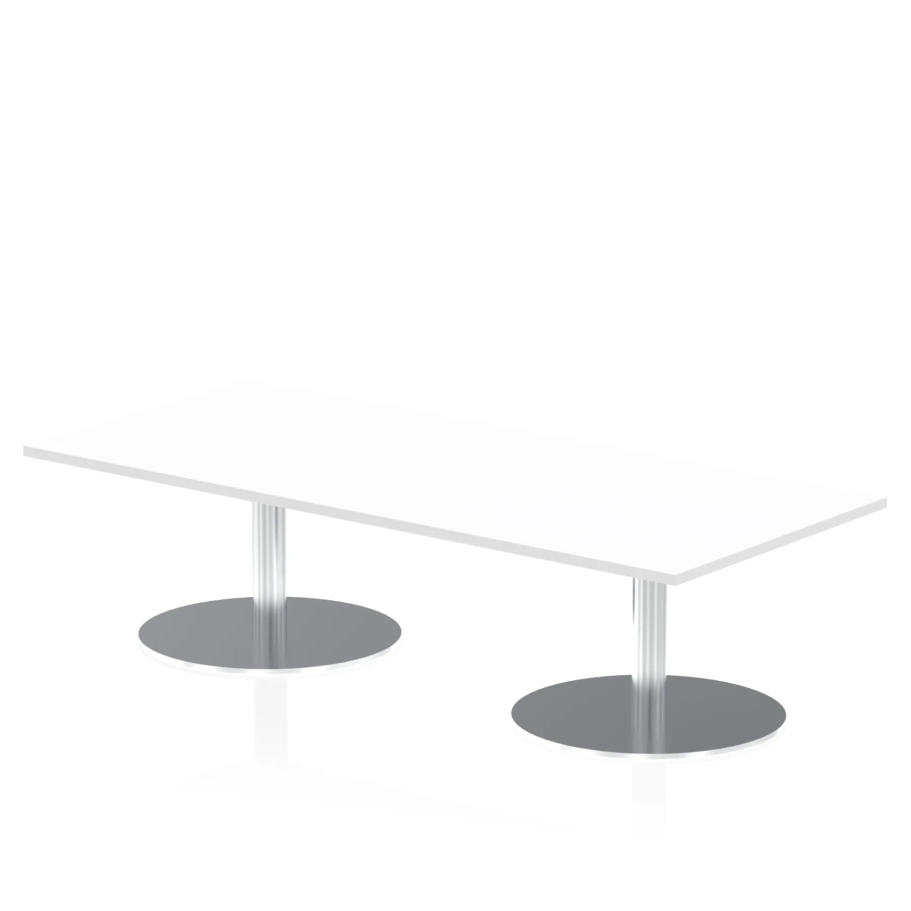 25mm thick desk top profile | Dual, brushed stainless steel effect circular base (580mm diameter) | Brushed stainless steel pillars (76mm diameter) | Weighted base provides stability | Two part bolted frame system