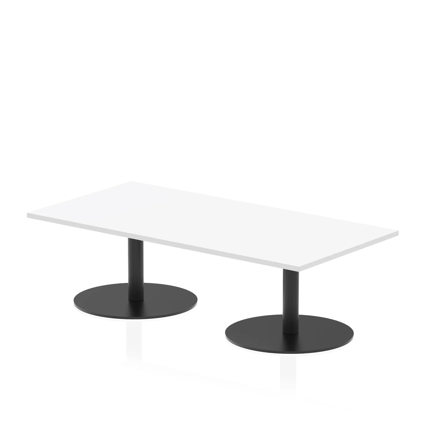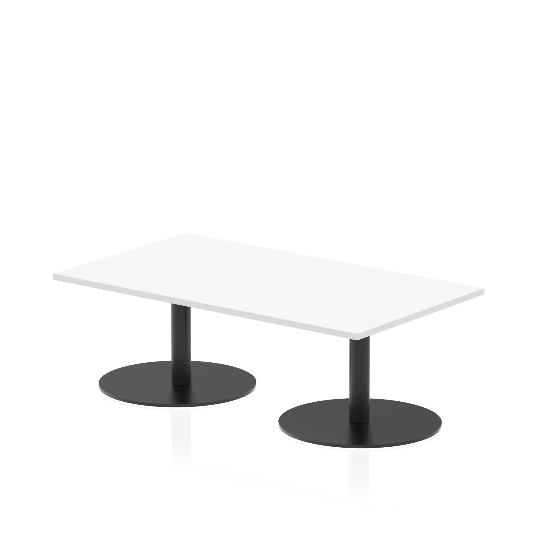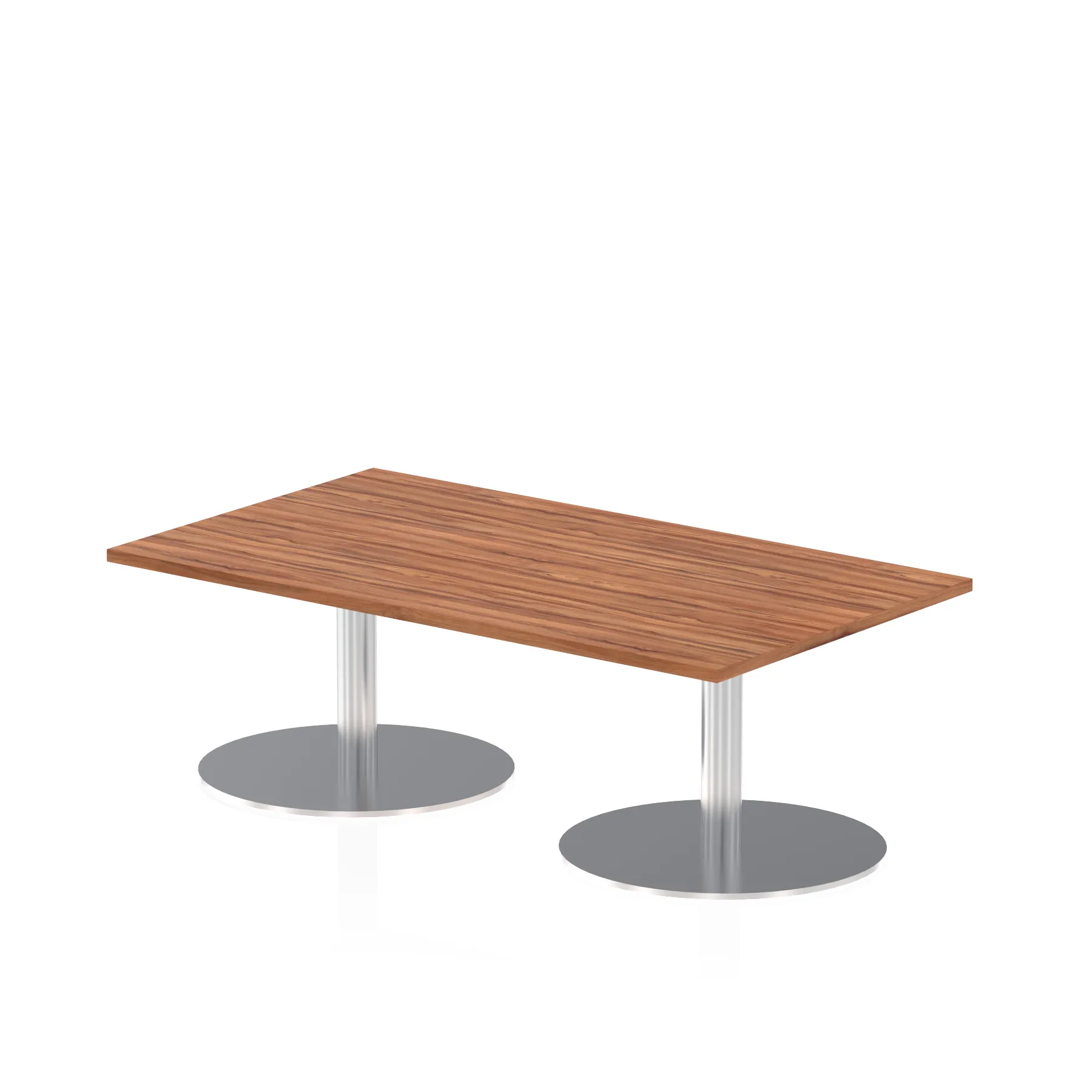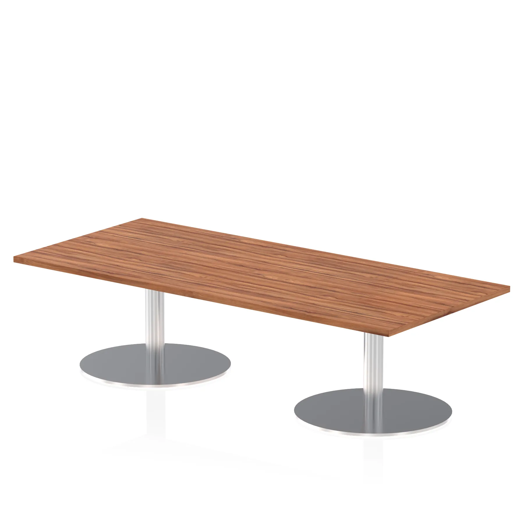 25mm thick desk top profile | Dual, brushed stainless steel effect circular base (580mm diameter) | Brushed stainless steel pillars (76mm diameter) | Weighted base provides stability | Two part bolted frame system