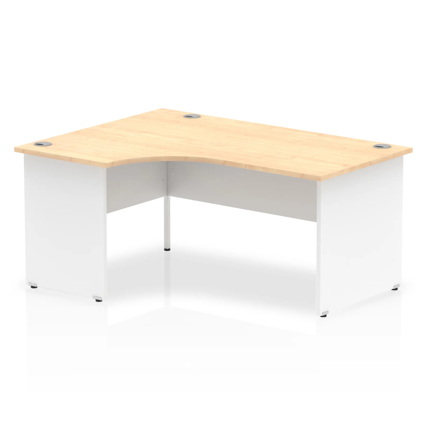 Impulse contract 1600 wide crescent desk | 25mm tops | Heat resistant beech melamine finish | 18mm modesty panel | 2mm protective abs edging | Matching wood panel end legs | 3 cable ports | Height adjustable feet | Steel to steel fixings | 3 modesty panel slots | 600 deep | Deep set modesty panel (5″) allows for compatibility of most screen clamp fittings | Weight Capacity 135Kg