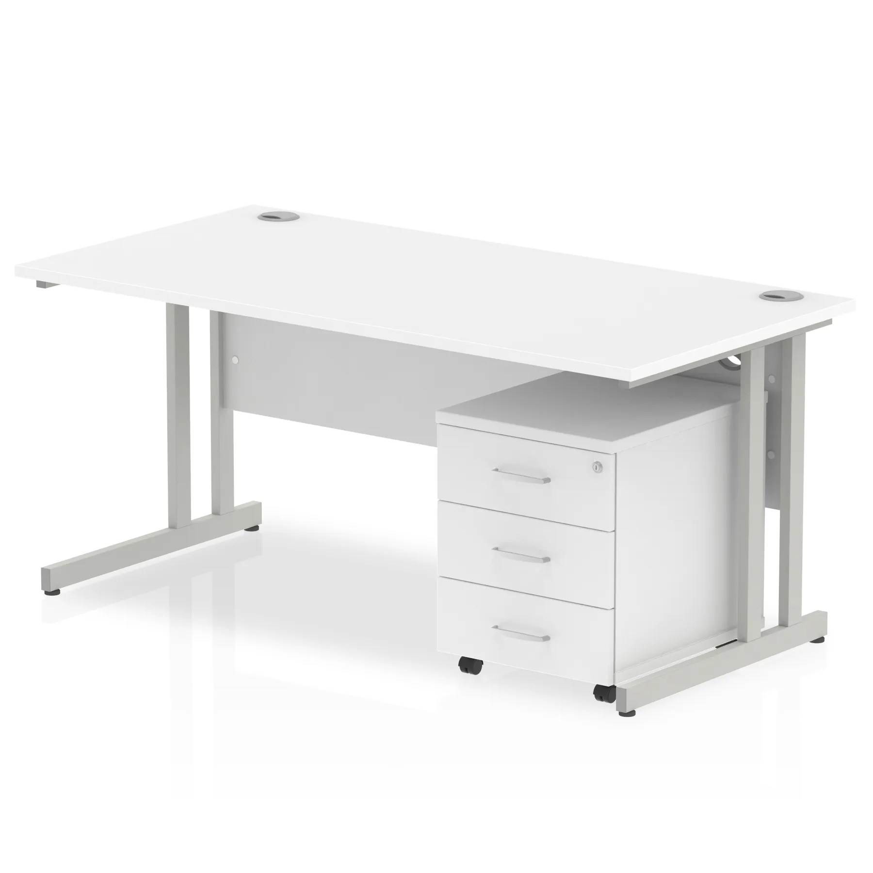 Impulse contract workstation | 25mm tops | Desk and pedestal combined | Heat resistant beech melamine finish | 18mm modesty panel | 2mm protective abs edging | Silver coated double strut legs | Multiple cable ports | Height adjustable feet | Steel to steel fixings | Modesty panel slots wire slots | Deep set modesty panel (5″) allows for compatibility of most screen clamp fittings