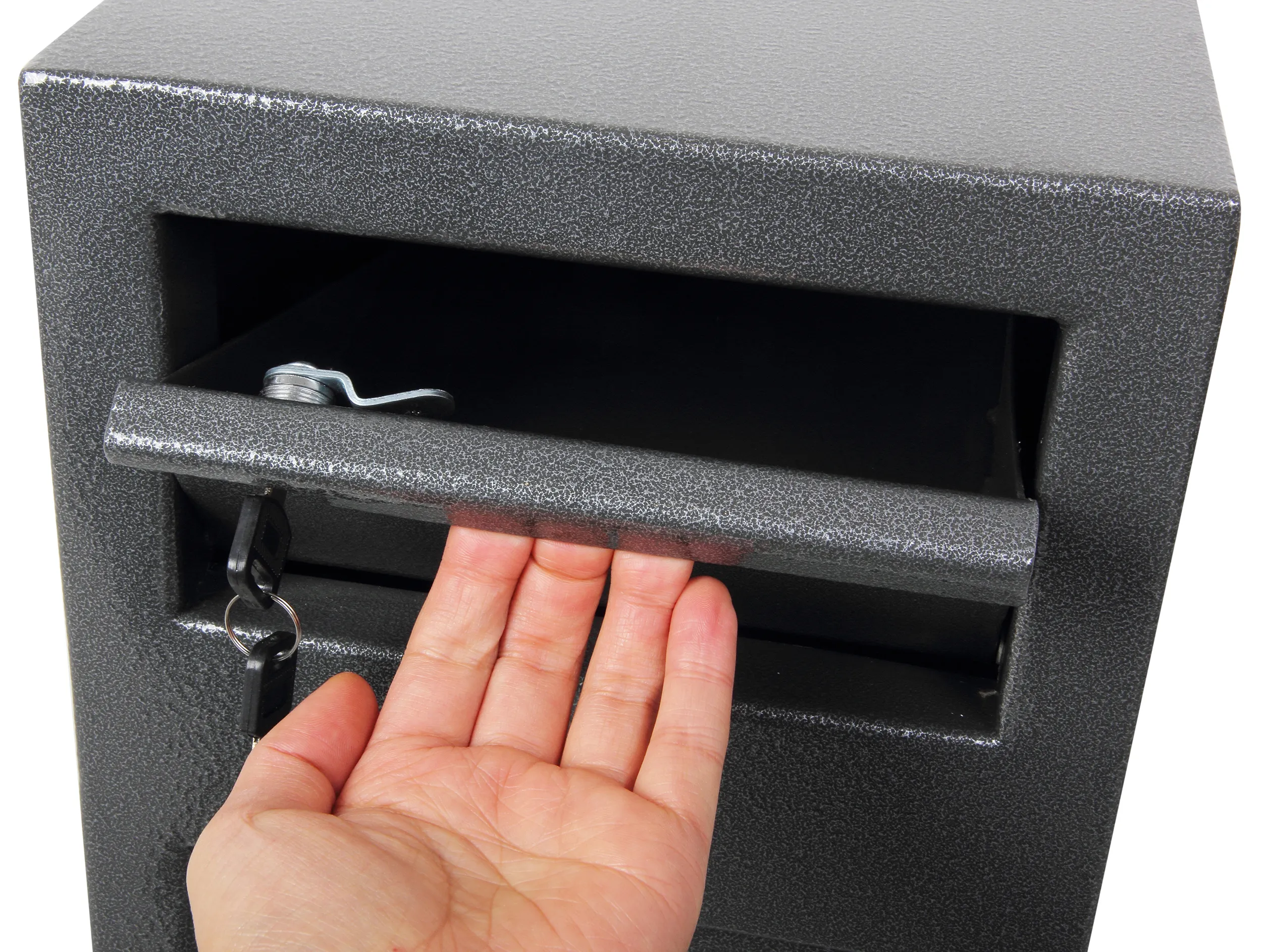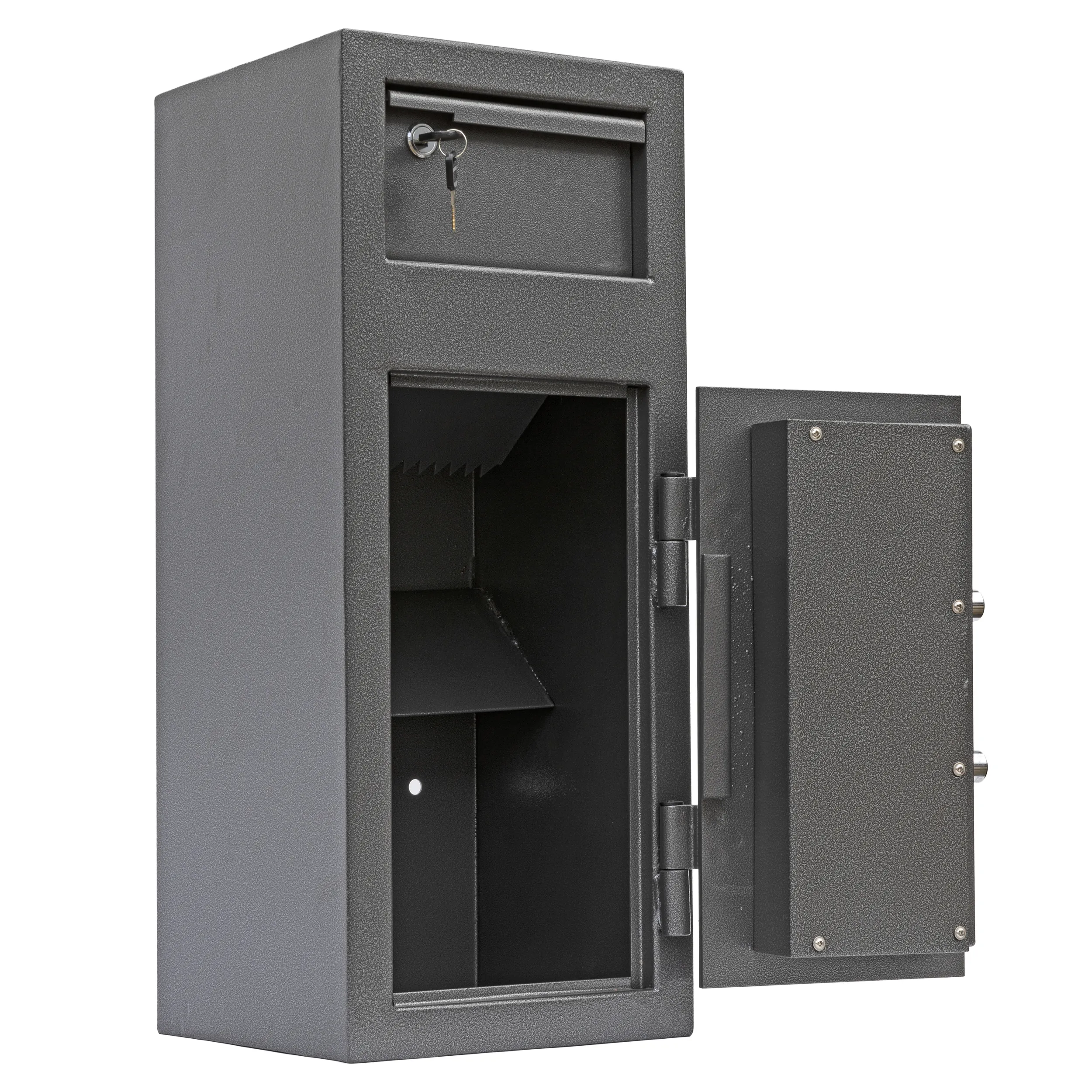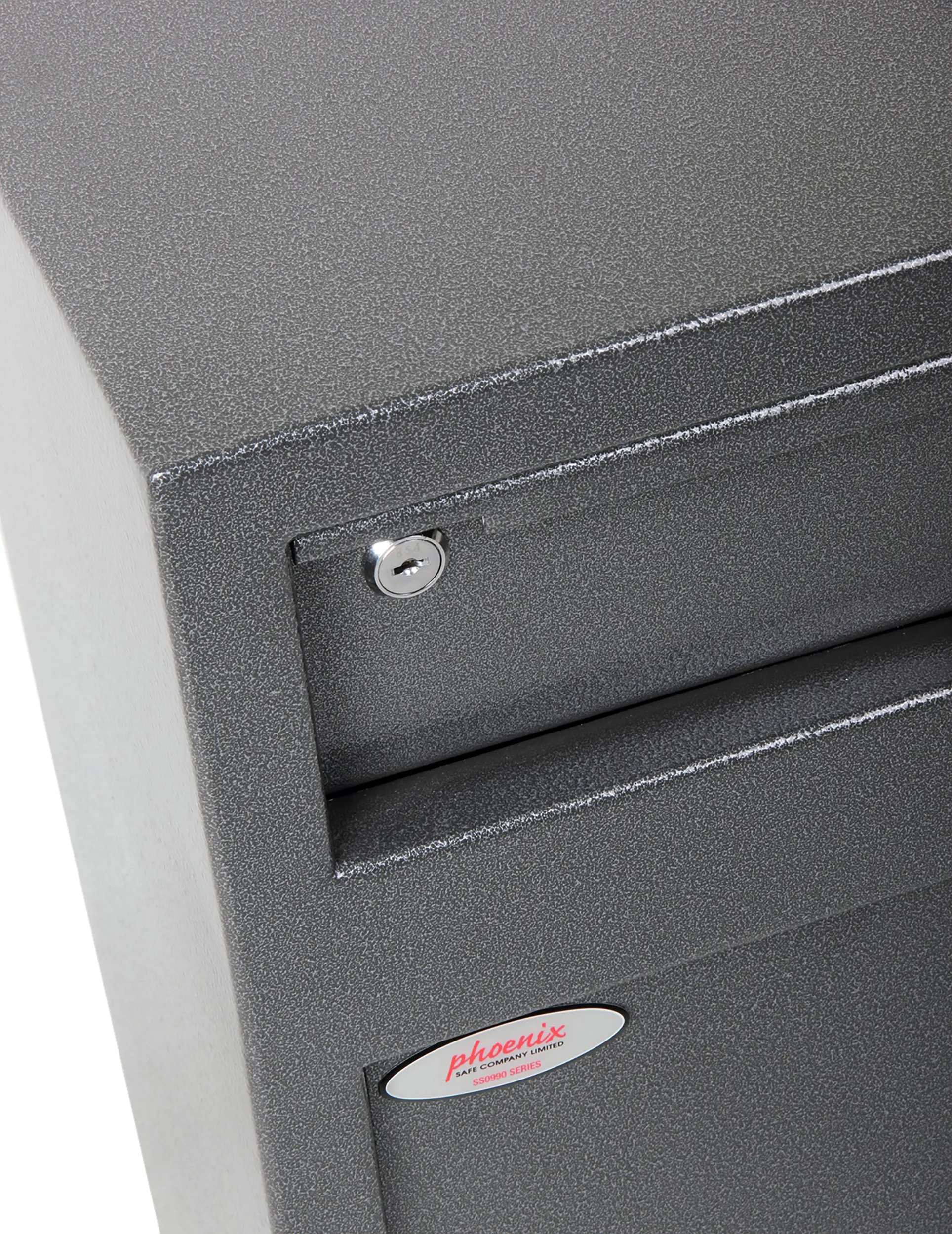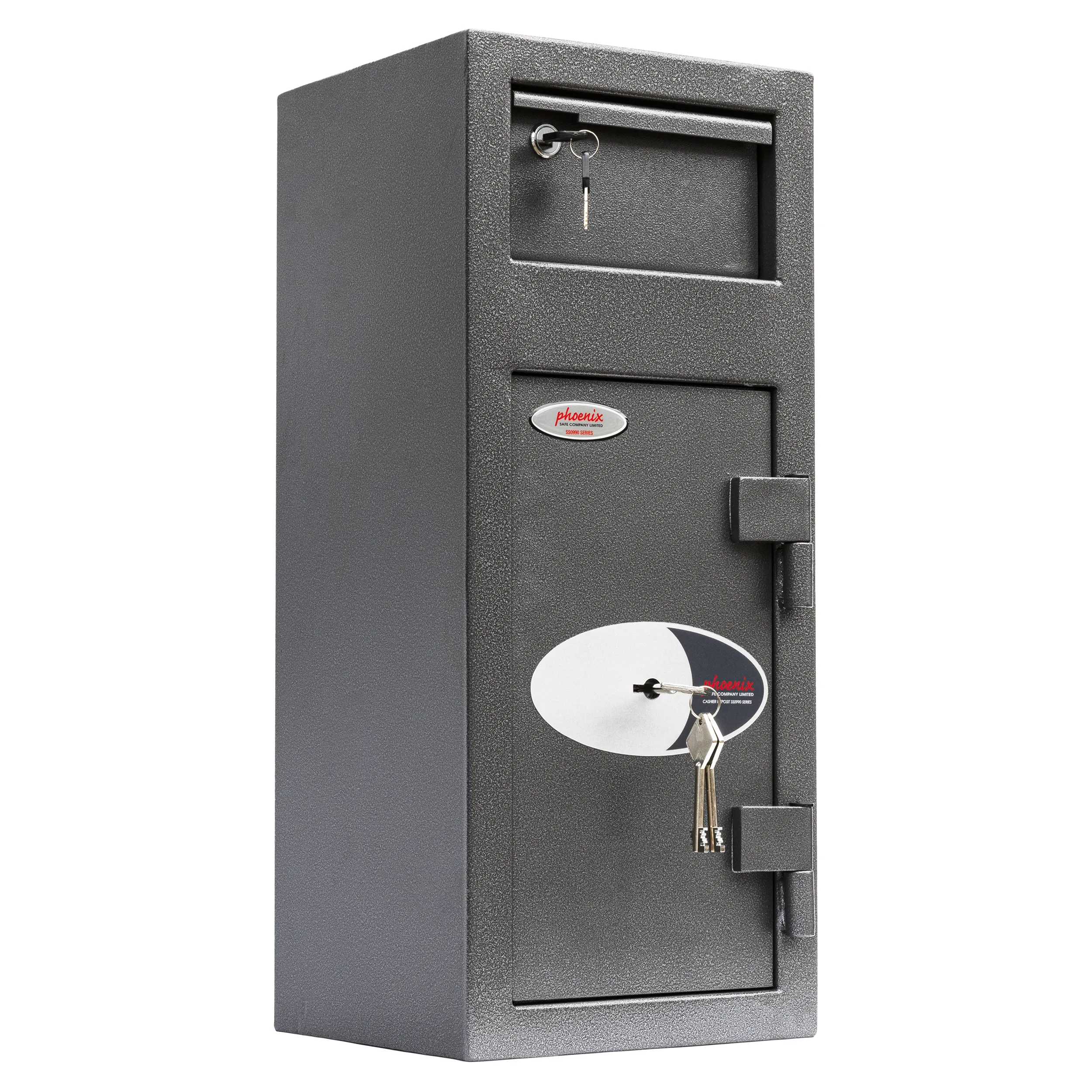 SECURITY PROTECTION – Recommended for overnight cash cover of £1,000 cash or £10,000 valuables | LOCKING – Fitted with a high security double bitted lock supplied with two keys | DEPOSIT FACILITY – Fitted with a lockable deposit (2 keys supplied) with Phoenix tilting baffle plate to ensure that the contents cannot be ‘fished out’ | CONSTRUCTION – Constructed of 6mm steel plate door and 2mm body | FIXING – Ready prepared for floor and wall fixing with bolts supplied | COLOUR – Finished in a high quality scratch resistant Metallic Graphite paint.
