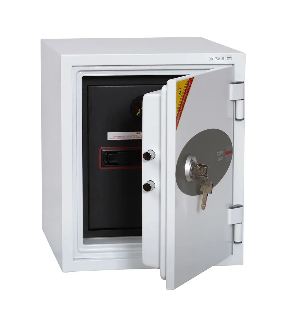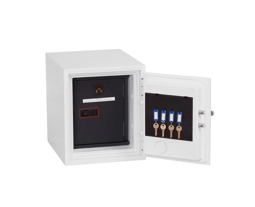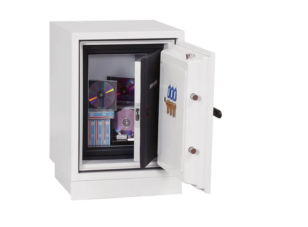 FIRE PROTECTION (DATA) – Tested to Swedish NT Fire 017 – 60dis (Size 1), 90dis (Size 2) or 120dis (Size 3) standard, providing 60, 90 or 120 minutes fire protection respectively for computer backup tapes | WATER RESISTANCE – Twin water resistant seals provide an airtight water resistant inner compartment for your computer media | SECURITY PROTECTION – The safe is recommended for an overnight cash risk of £1,500.00 or £15,000.00 valuables | DROP TEST – Fire and impact tested from 9.1 metres for resistance to the impact of falling through the burning floors of a building | SPECIAL FEATURES – Fitted with 4 internal key hooks | COLOUR – Finished in a high quality scratch resistant paint RAL9003 White