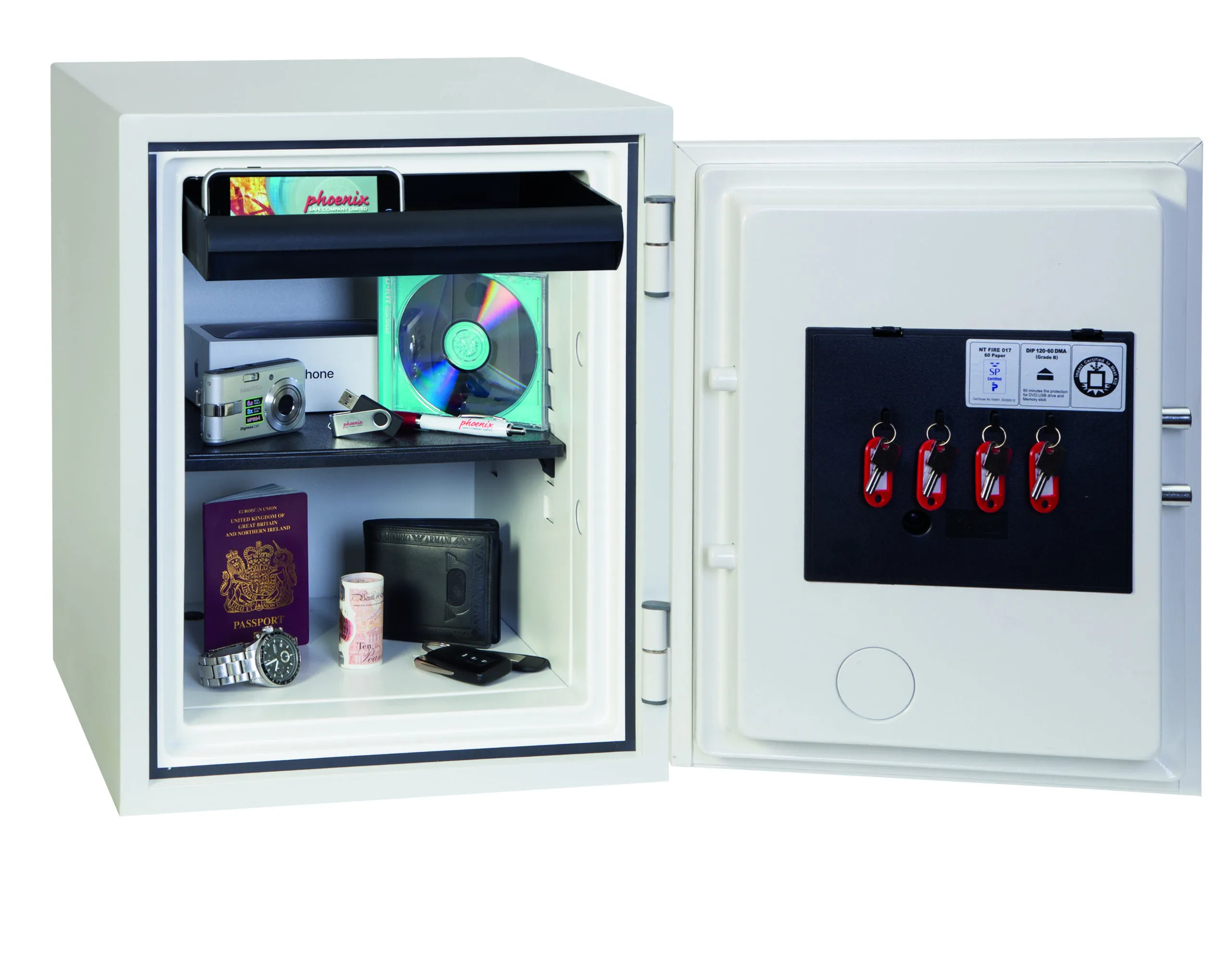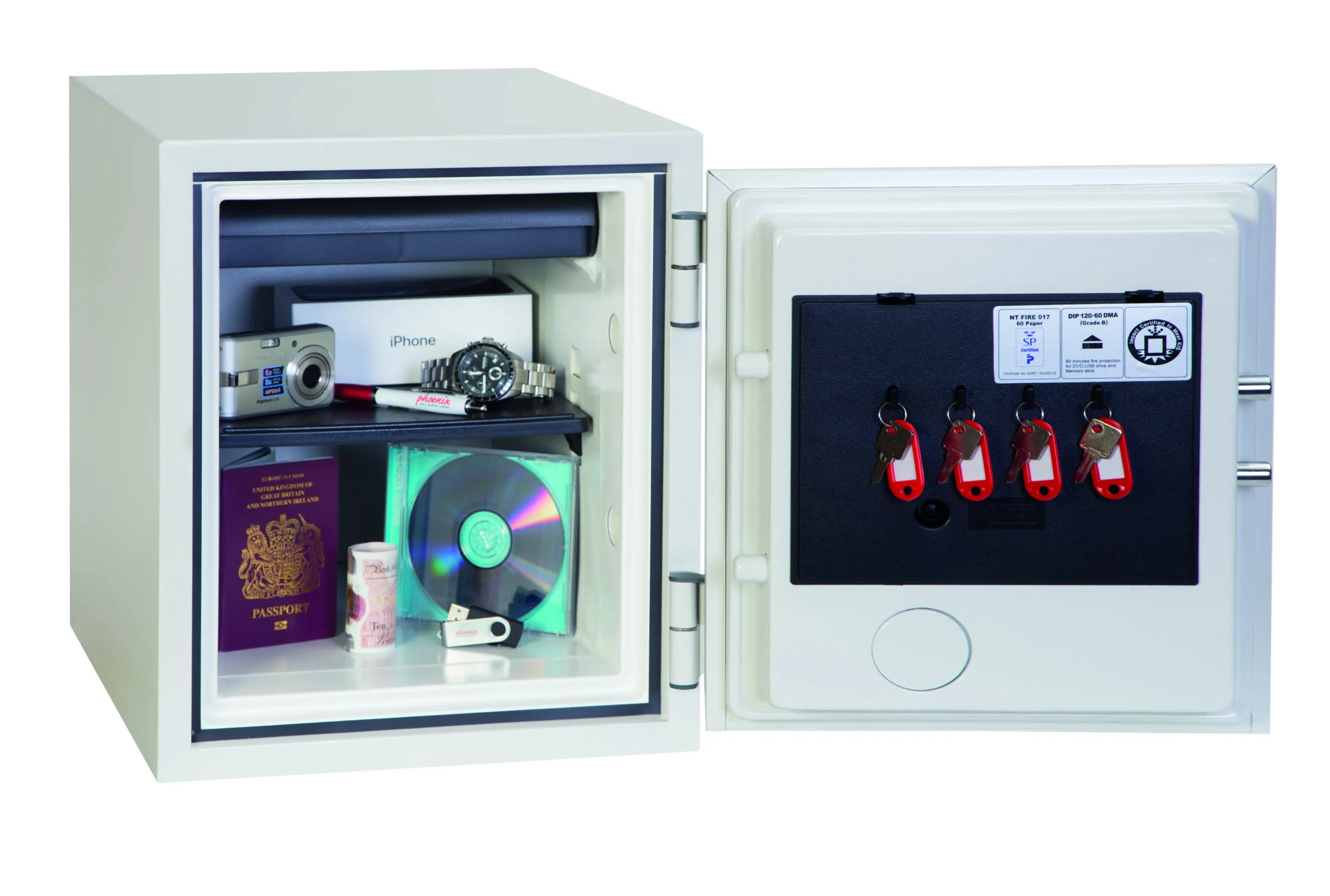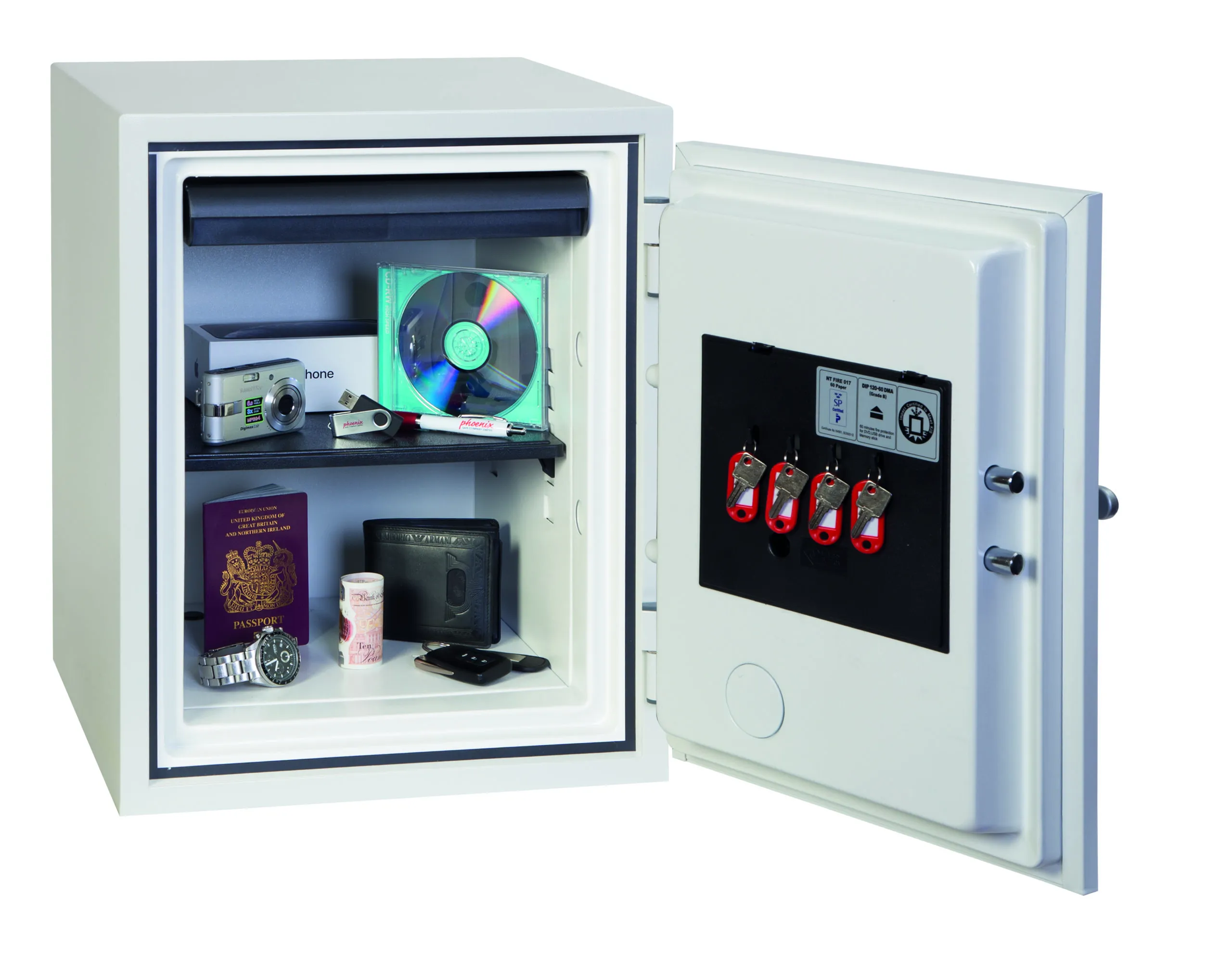 FIRE PROTECTION (PAPER) – Tested to the International NT Fire 017 – 60 fire test standard, at the Swedish SP Testing Centre providing 60 minutes fire protection for paper documents | FIRE PROTECTION (DIGITAL MEDIA) – Tested to MTC – DIP120 – 60DM fire test standard, providing 60 minutes fire protection for digital media, DVD’s, USB memory sticks & hard drives | SECURITY PROTECTION – The safe is recommended for an overnight cash risk of £2,000.00 or £20,000.00 valuables and is also ready prepared for floor fixing, with fixing bolts for concrete floors supplied | DROP TEST – Drop tested from 9.1 metres for resistance to the impact of falling through the burning floors of a building or the collapse of the building | SPECIAL FEATURES – Supplied with 4 internal key hooks, pull out drawer and (for Size 2 or 3) height adjustable shelf | COLOUR – Finished in a high quality scratch resistant paint RAL9003 White