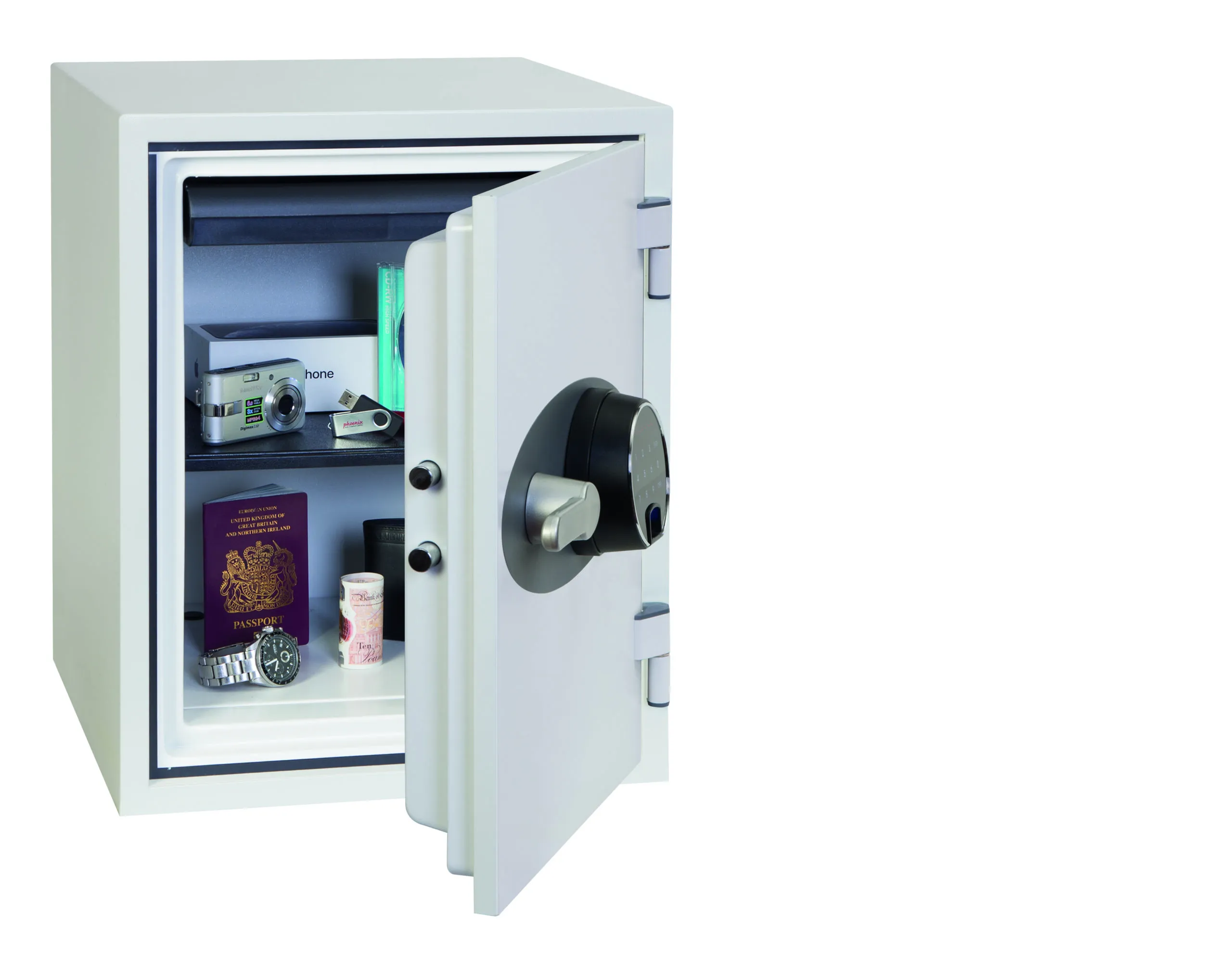 Fingerprint – Fitted with an advanced high security touchscreen keypad & fingerprint lock with clear LED display, internal alarm, dual control, hidden code and scrambled code that can be programmed as standard with up to 128 fingerprints